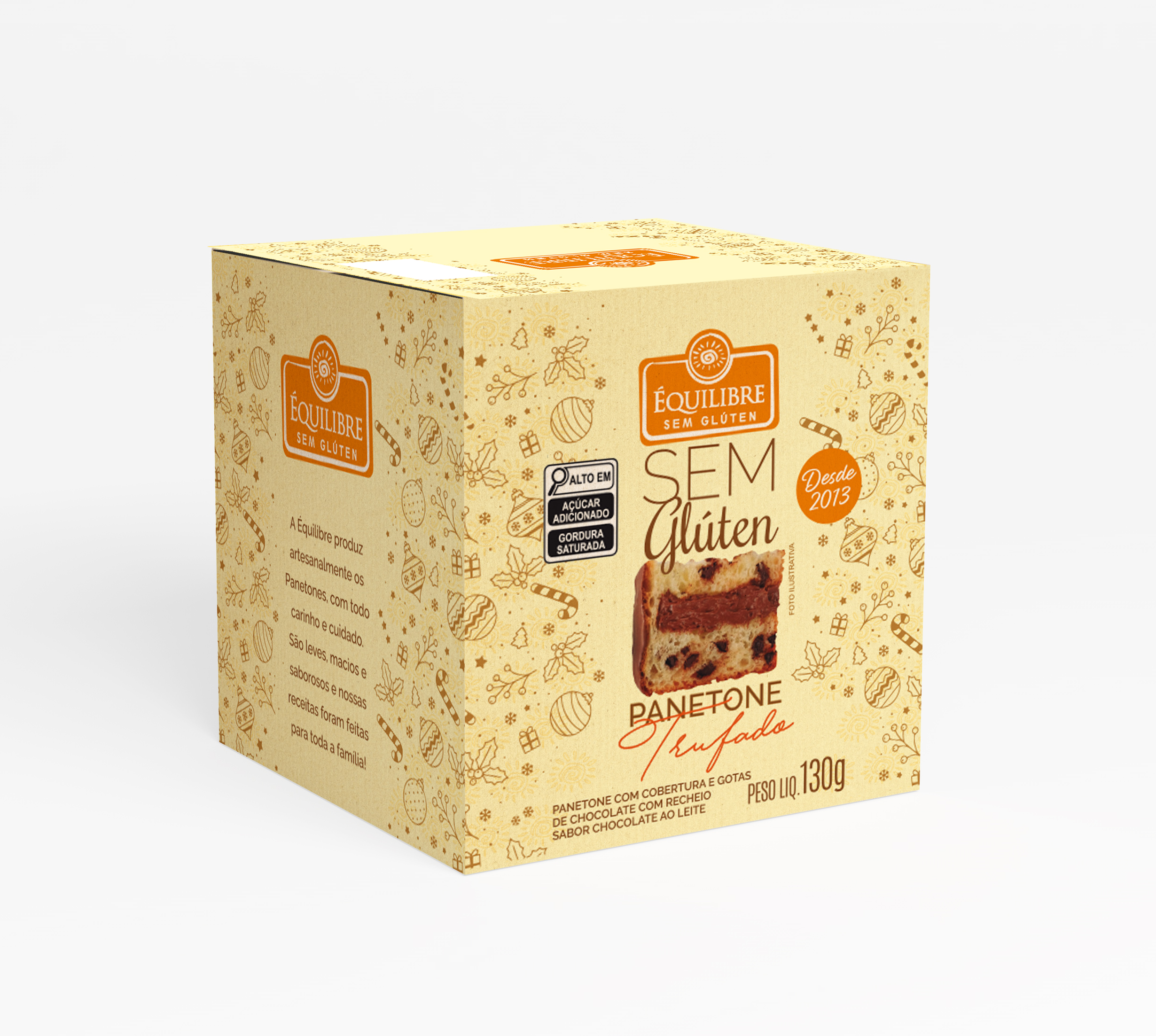 Panetone gotas de chocolate meio amargo,com recheio de ganache chocolate ao leite,coberto com chocolate meio amargo. Sem glúten. Com ovos e açúcar, fécula de mandioca e amido de milho. Textura leve e macia igual ao panetone tradicional. O sabor vai te surpreender!