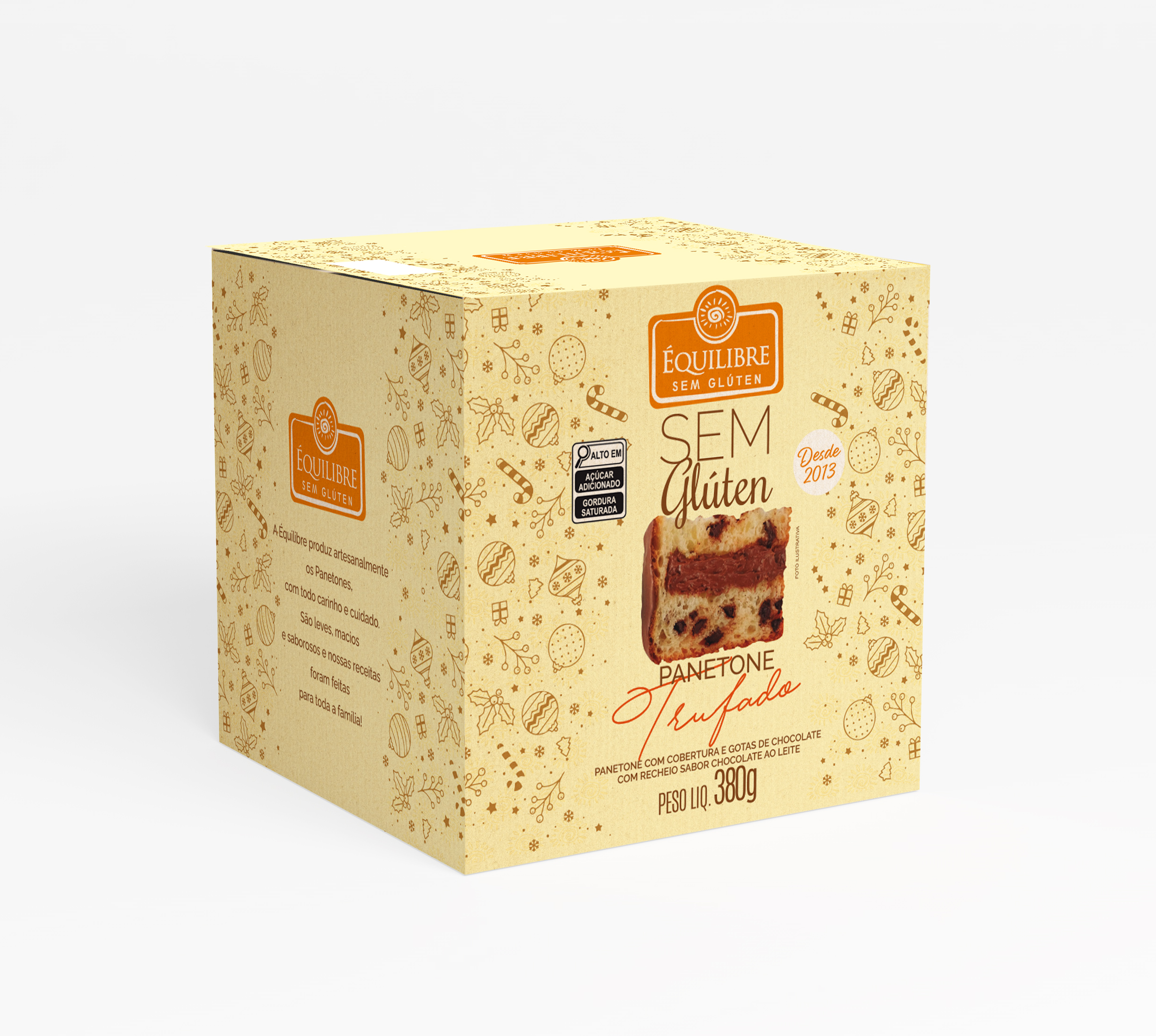 Panetone gotas de chocolate meio amargo,com recheio de ganache chocolate ao leite. Sem glúten. Com ovos e açúcar, fécula de mandioca e amido de milho. Textura leve e macia igual ao panetone tradicional. O sabor vai te surpreender!